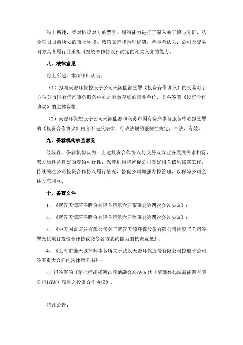 天源环保表示,公司控股子公司武汉天源能源有限公司与乌苏市国有资产事务服务中心拟就投资建设第七师胡杨河市兵地融合2GW光伏(新疆兴起航新能源有限公司1GW)项目签署《第七师胡杨河市兵地融合2GW光伏(新疆兴起航新能源有限公司1GW)项目之投资合作协议》,项目总投资约30.2亿元。