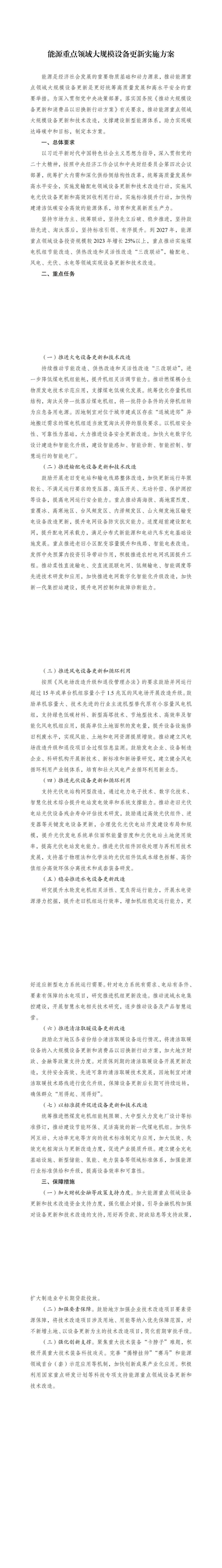 为贯彻落实国务院《推动大规模设备更新和消费品以旧换新行动方案》(国发〔2024〕7号),推动能源重点领域大规模设备更新和技术改造,国家发展改革委、国家能源局组织编制了《能源重点领域大规模设备更新实施方案》。现印发给你们,请认真组织实施。