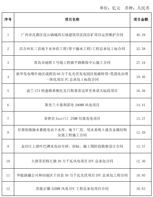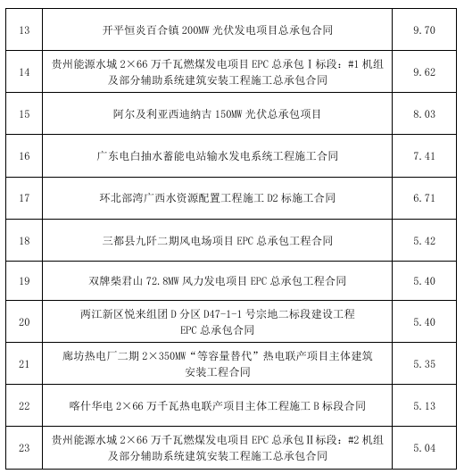 注: 1.能源电力业务包括水电、风电、太阳能发电、火电、电网等; 2.水资源与环境业务包括水利、水务、水环境治理和水生态修复等; 3.城市建设与基础设施业务包括市政、房建、铁路、城市轨道交通、公路、机场、港口 与航道等; 4.其他业务指除以上三项业务外的业务; 5.上表中分项数据加总之和与合计数之间的差异系四舍五入原因所致。