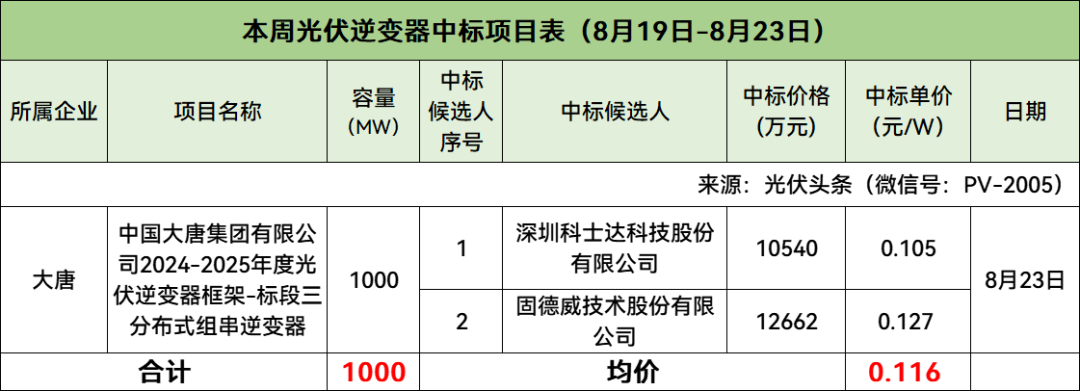 本周大唐光伏逆变器中标项目有明确中标价格,合计规模1000MW,中标均价为0.116元/W。