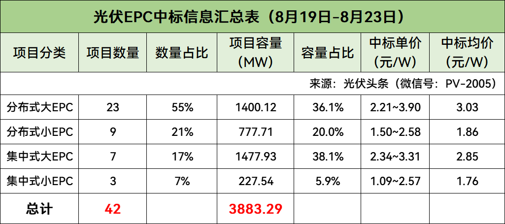 从中标项目的分类来看,本周分布式大EPC项目为23个,项目容量为1400.12MW,中标价格落在2.21~3.90元/W之间,均价为3.03元/W。本周集中式大EPC项目7个,项目容量为1477.93MW,中标价格落在2.34~3.31元/W之间,均价为2.85元/W。