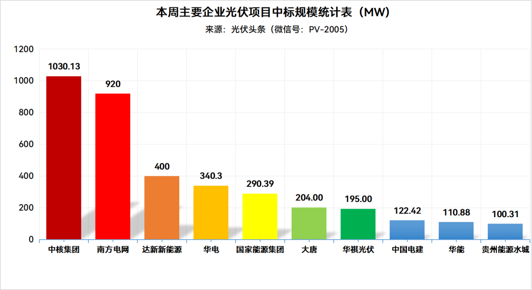 统计本周中核集团、南方电网、华电、国家能源集团、大唐、中国电建、华能、三峡、国家电投、华润等企业发布了42个中标项目,总规模3883.29MW。其中,中核集团以1030.13MW位列第一,南方电网以920MW排名第二,宁夏达新新能源有限公司以400MW位列第三。