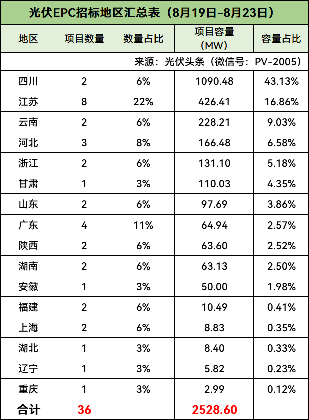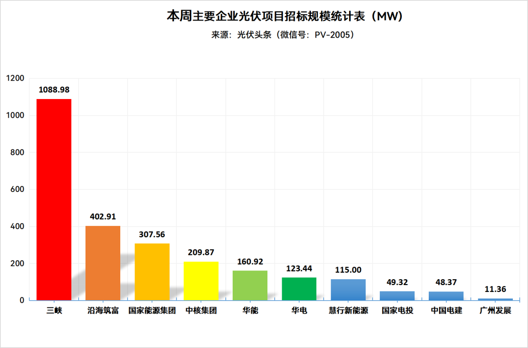 统计,本周三峡、国家能源集团、中核集团、华能、华电、国家电投、中国电建、华润、广州发展等企业发布了36个光伏招标项目,装机规模合计2528.60MW。