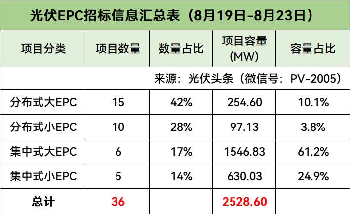 从本周招标项目类别来看,分布式光伏项目有25个,集中式光伏项目有11个,大EPC项目有21个,小EPC项目有15个。