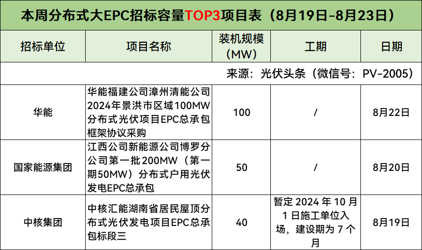 分布式大EPC项目有15个,其中招标容量最大项目为华能福建公司漳州清能公司2024年景洪市区域100MW分布式光伏项目EPC总承包。项目计划建设容量为100MW(以直流侧容量为准),单个具体项目子合同的施工工期不超过6个月。