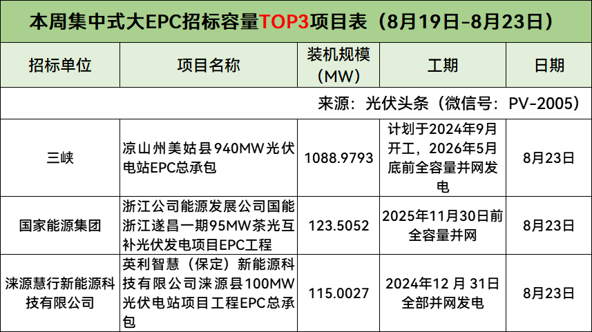 集中式大EPC项目有6个,其中招标容量最大项目为三峡凉山州美姑县940MW光伏电站EPC总承包。本项目直流侧总装机容量1088.97932MWp,交流侧容量940.2MW。本项目计划于2024年9月开工,2026年5月底前全容量并网发电。