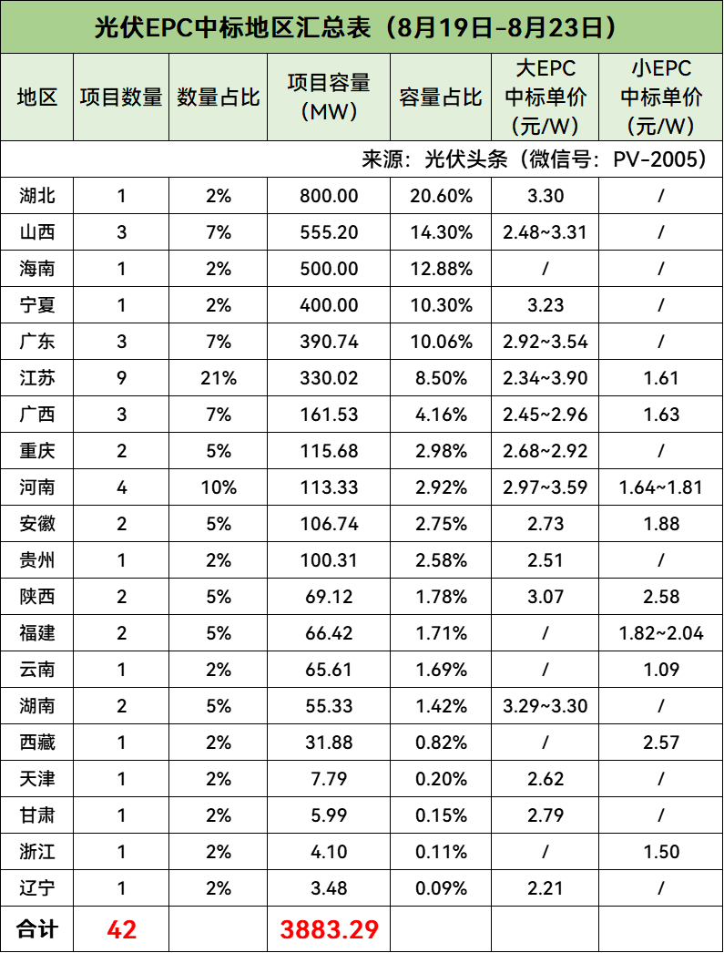 对8月第3周(8月19日-8月23日)光伏EPC招/中标项目不完全统计,本周招标规模合计2528.60MW,中标规模合计3883.29MW,招中标规模合计6411.89MW。