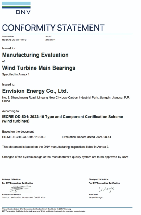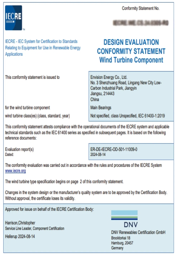 IECRE(国际电工委员会可再生能源设备认证互认体系)所执行的标准是目前全球最严格的可再生能源认证标准之一,也是评估风电机组及其关键零部件可靠性的主流核心标准。DNV专家团队经过半年的设计评估、制造评估及最终评估后,确认EN主轴承符合IECRE OD-501:2022认证方案对风机主轴承所有相关要求,并据此颁发了主轴承认证部件证书。