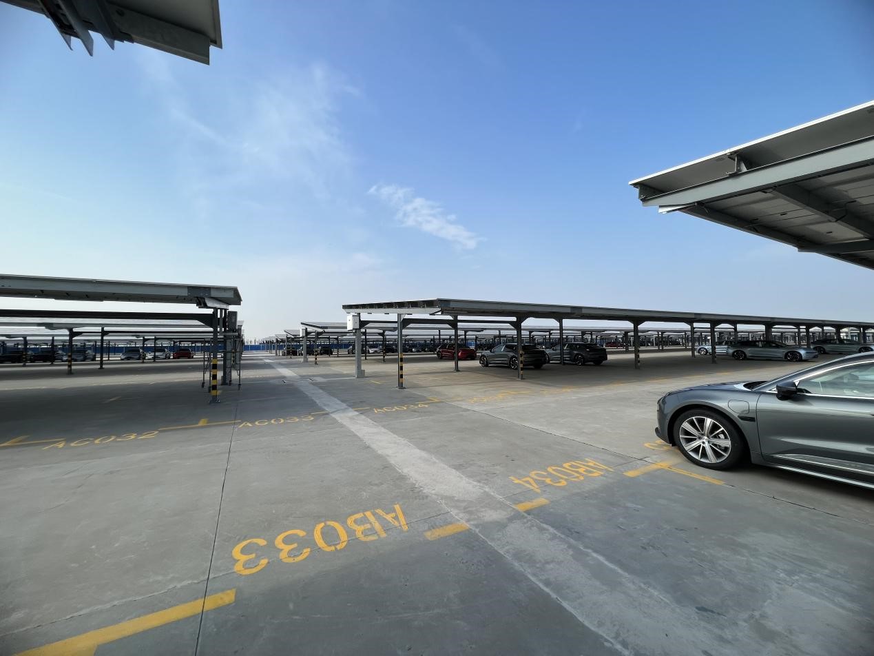 吉利厂区停车棚采用光伏一体化结构,光伏板架设于停车位上方的钢桁架上,以光伏电池板代替车棚顶面,实现了停车、发电、充电的完美融合。与普通车棚相比,光伏车棚除了起到隔热、防雨、遮阳的作用外,还可以完成太阳能的收集,实现自发自用、余电上网,新颖整齐的外观更加让人赏心悦目,给厂区绿色低碳场景再添新貌。