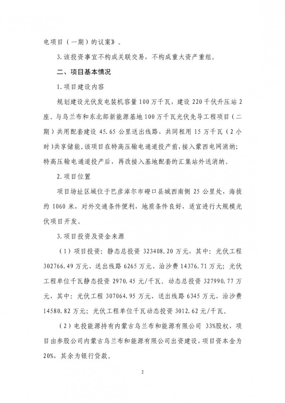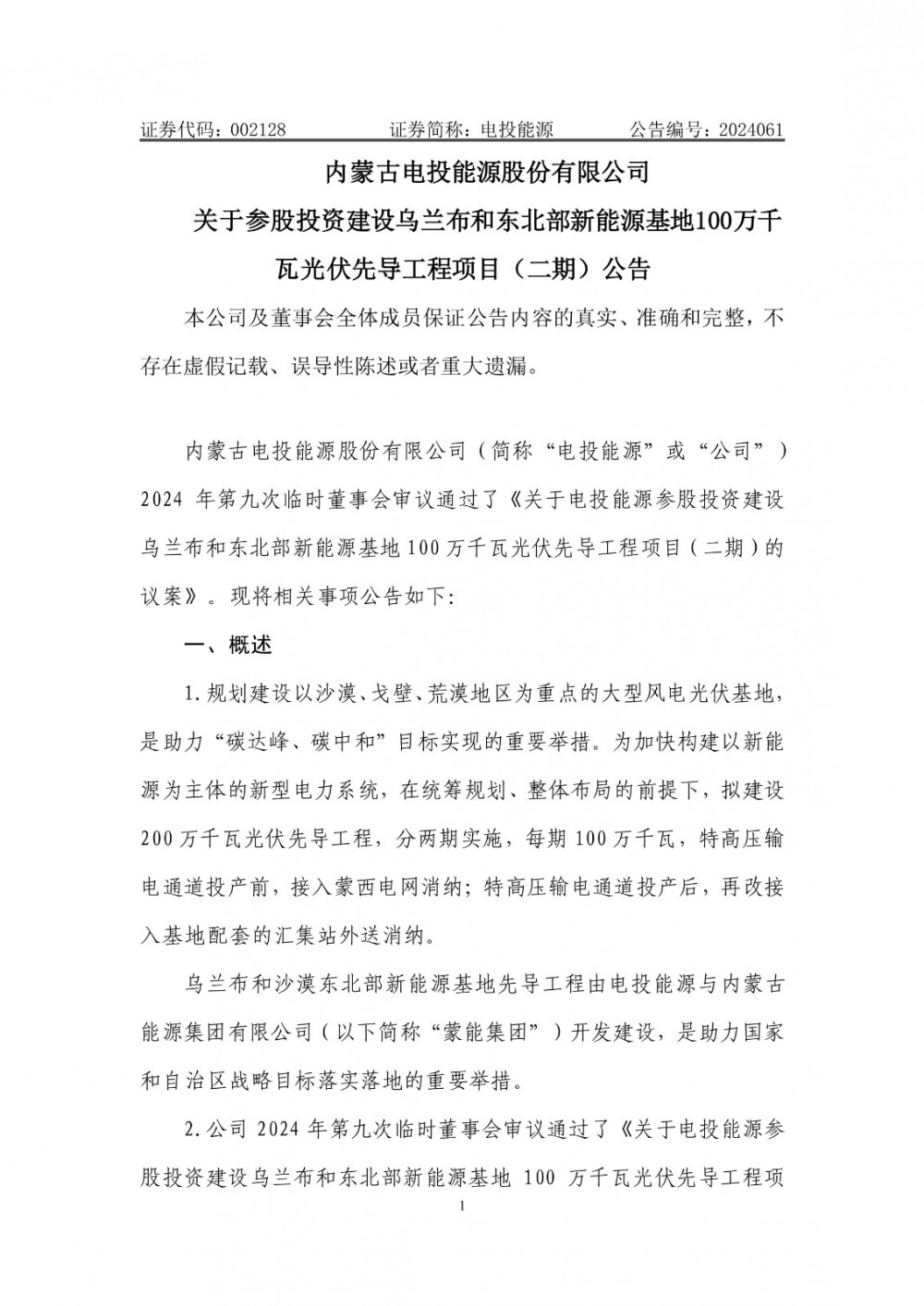 2024-04-30 9月3日晚间,内蒙古电投能源股份有限公司发布关于参股投资建设乌兰布和东北部新能源基地先导工程100万千瓦光伏发电项目一期、二期公告。
