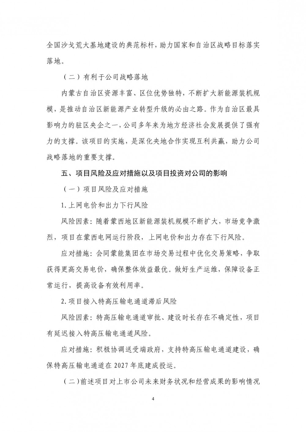 公告还表示,项目由蒙能集团控股,电投能源参股,积极发挥各自优势共同将基地打造成为全国沙戈荒大基地建设的典范标杆,助力国家和自治区战略目标落实落地。该项目的实施,是深化央地合作实现互利共赢,助力公司战略落地的重要支撑。