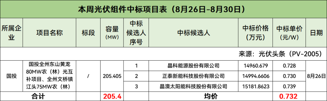 本周国投集团光伏组件中标项目有明确中标价格,合计规模205.405MW,中标均价为0.732元/W。