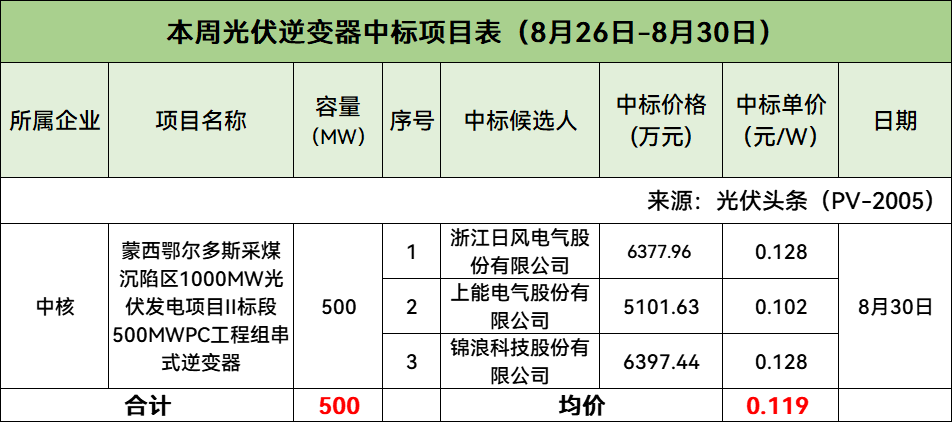 本周中核集团光伏逆变器中标项目有明确中标价格,合计规模500MW,中标均价为0.119元/W。