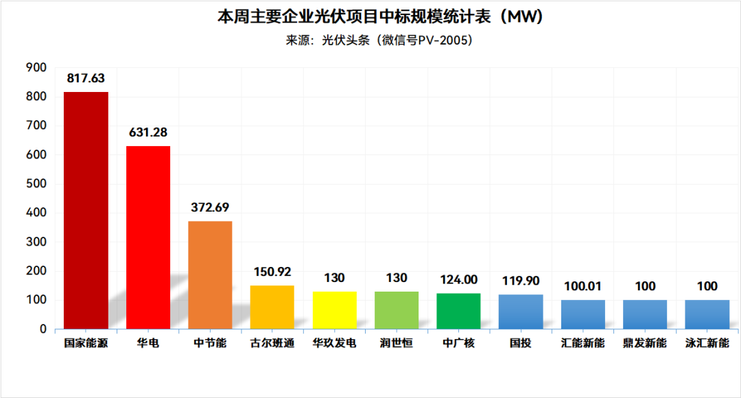 统计本周国家能源集团、华电、中节能、中广核、国投等企业发布了43个中标项目,总规模3028.96MW。其中,国家能源集团以817.63MW位列第一,华电以631.28MW排名第二,中节能以372.69MW位列第三。
