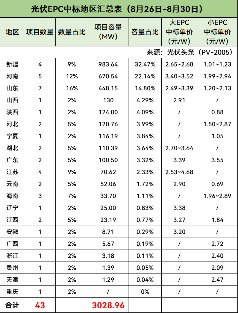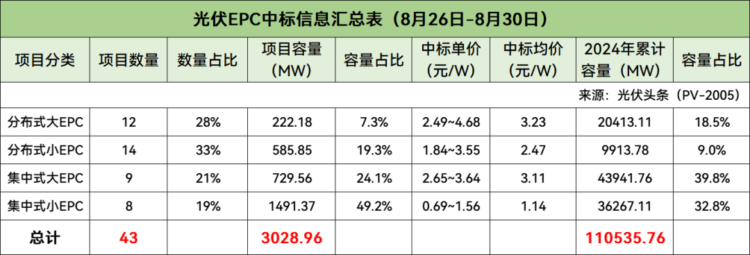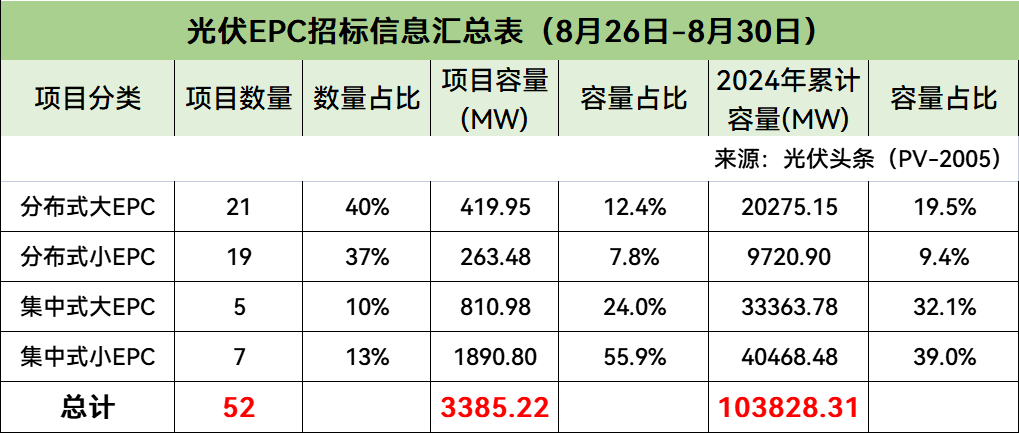 对8月第4周(8月26日-8月30日)光伏EPC招/中标项目不完全统计,本周招标规模合计3385.22MW,中标规模合计3028.96MW,招中标规模合计6414.18MW。