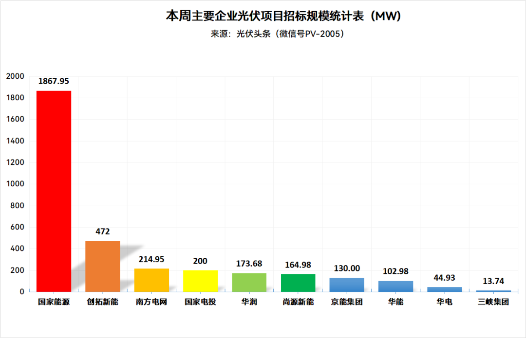 具体到本周的招标市场,国家能源集团以1867.95MW排名第一。青海创拓新能源科技有限公司以容量472MW,排名本周第二。南方电网则以214.95MW位列第三。