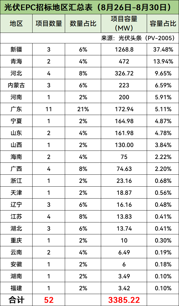 统计,本周国家能源集团、南方电网、国家电投、华润、华能、华电、三峡等企业发布了52个光伏招标项目,装机规模合计3385.22MW。