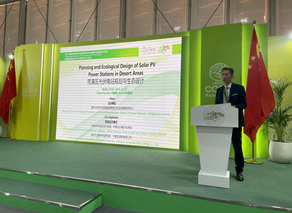 当地时间12月10日上午,“荒漠区光伏电站规划与生态设计”边会在利雅得《联合国防治荒漠化公约》第十六次缔约方大会“中国馆”举办,本次边会由清华大学社科学院能源转型与社会发展研究中心主办,水电水利规划设计总院、中国治沙暨沙业学会、清华大学碳中和研究院、宁夏龙源新能源公司联合主办。