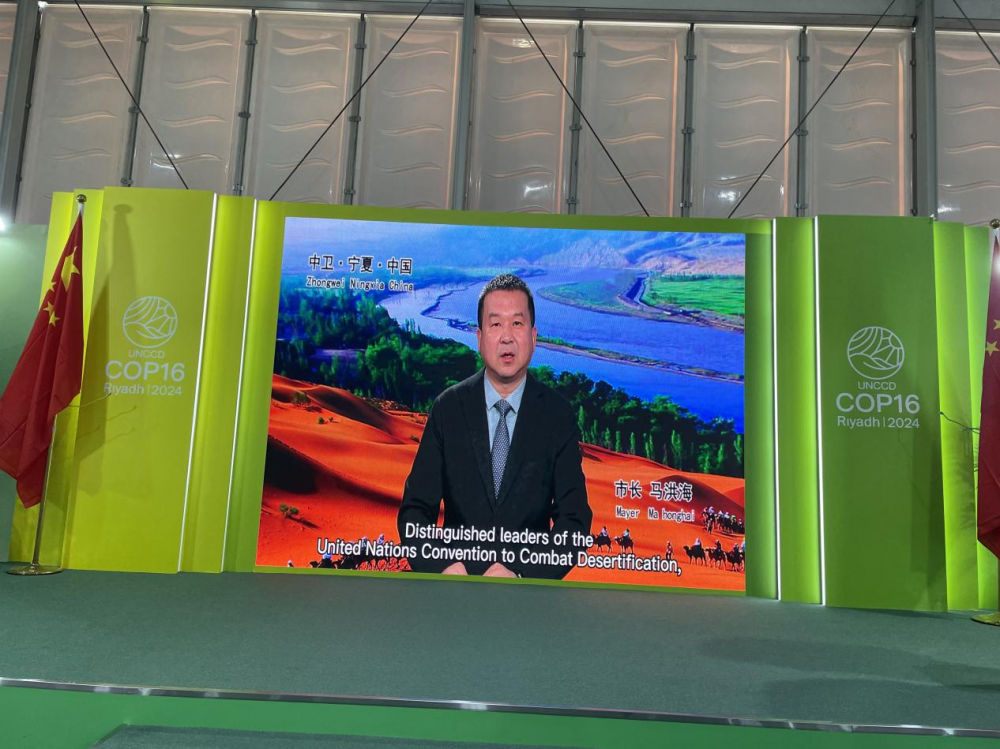 中卫市市长马洪海简要介绍了中卫市“光伏治沙”的路径和成就。近年来,中卫市沙漠旅游、沙漠农业、沙漠光伏产业蓬勃发展,逐步走出了一条生态效益、社会效益、经济效益相得益彰的发展新路,中卫防治荒漠化有效做法和成功经验每年吸引世界各国万名专家学者前来考察学习,向世界展示了防治荒漠化的“中国方案”和“中卫模式”。