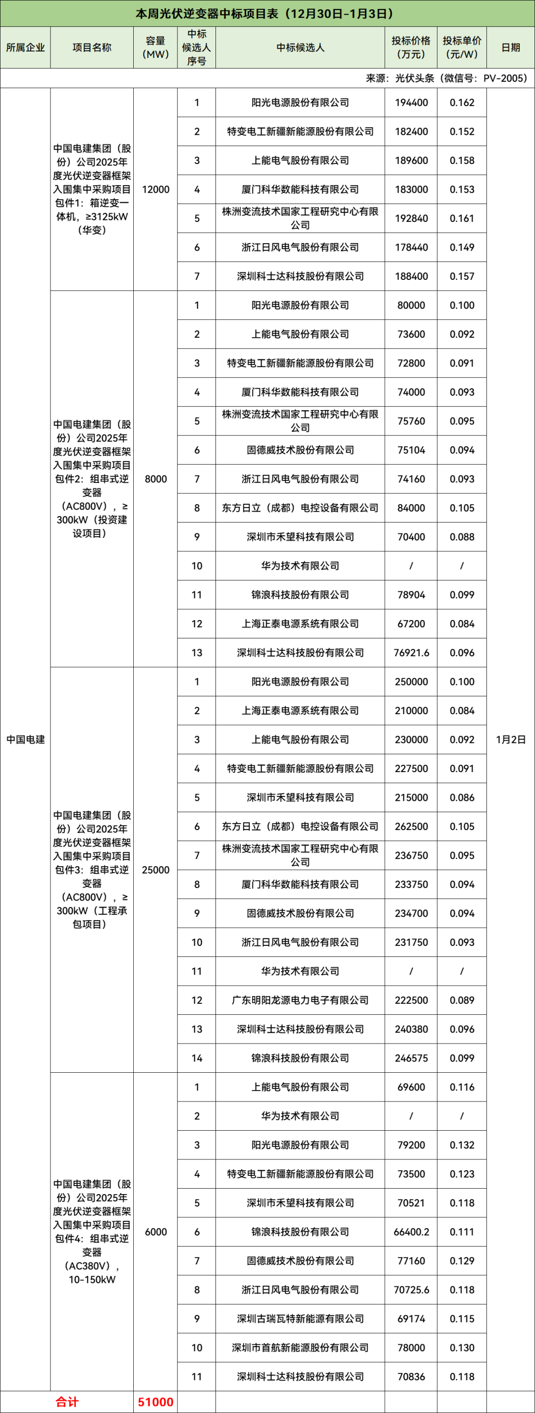 本周中国电建集团(股份)公司2025年度光伏逆变器框架入围集中采购项目公示中标候选人,规模为51GW,其中最高价为0.162元/W,最低价为0.084元/W。