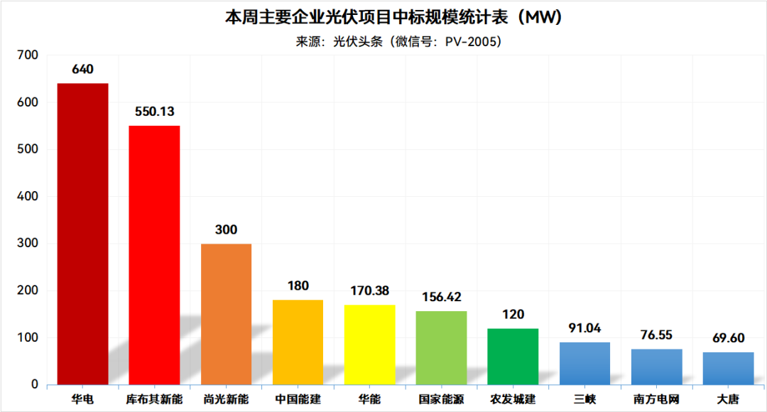 根据公开信息统计,本周华电、中国能建、华能、国家能源集团、三峡、南方电网、大唐等企业发布了38个中标项目,总规模2425.4MW。其中,华电以640MW位列第一,鄂尔多斯市库布其新能源有限公司以550.13MW排名第二,河南尚光新能源科技有限公司以300MW位列第三。