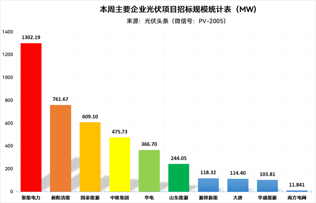 具体到本周的招标市场,且末聚能电力开发有限公司以1302.19MW排名第一。阜平昶阳清洁能源开发有限公司以761.67MW排名本周第二。国家能源集团以609.1MW位列第三。