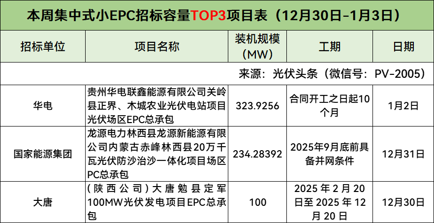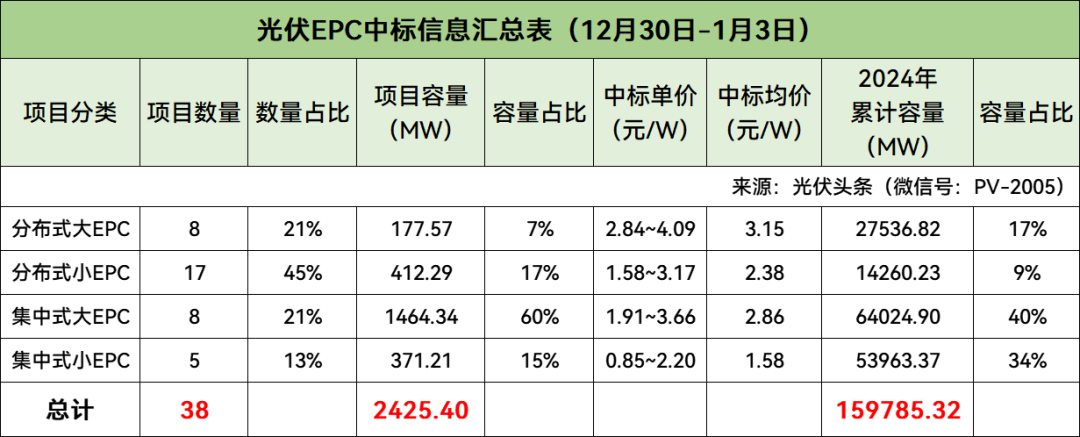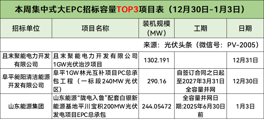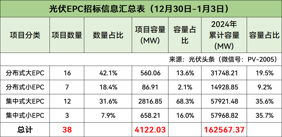 对2025年1月第1周(12月30日-1月3日)光伏EPC招/中标项目公开信息不完全统计,本周招标规模合计4122.03MW,中标规模合计2425.4MW,招中标规模合计6547.43MW。