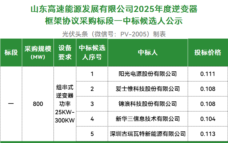 获悉,1月11日,山东高速能源发展有限公司2025年度光伏组件/逆变器框架协议采购公示中标候选人。8家光伏组件企业,5家逆变器企业入围山东高速本次集采项目。