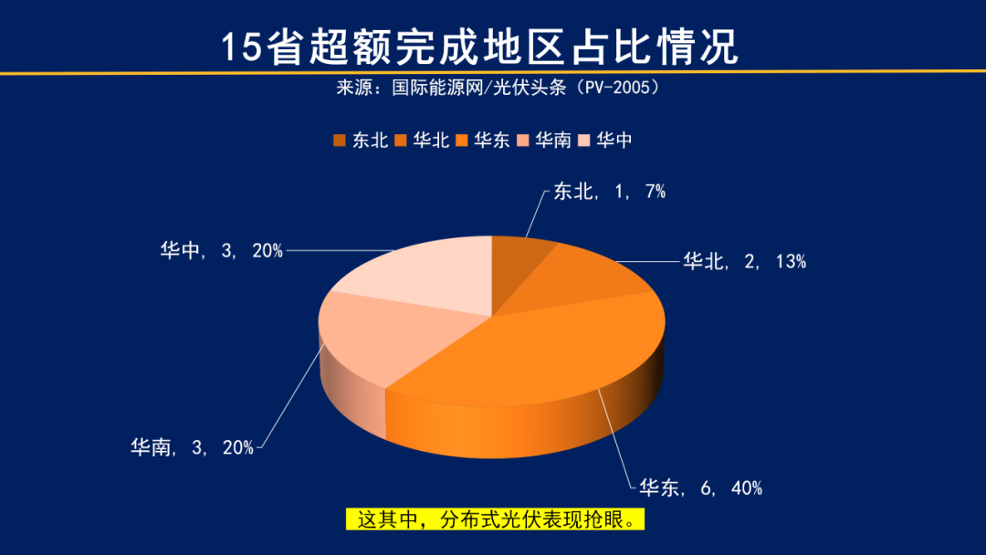 在超额完成的15省中:华东地区有6省,占比40%,为福建、浙江、江苏、安徽、江西、山东;华南地区有3省,占比20%,为广东、海南、广西;华中地区有3省,占比20%,为河南、湖北、湖南;华北地区有2省,占比13.3%,为天津、河北;东北地区有1省,占比6.7%,为辽宁。