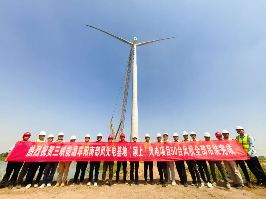 该项目风电部分由颍上25万千瓦、阜南30万千瓦风电项目构成,是三峡集团首个自建轮毂高度160米钢混塔风电项目,共安装110台5兆瓦风电机组,对探索风电机组的大型化发展以及高切变地区风能资源的有效开发利用具有积极推动作用。风电项目作为安徽阜阳基地项目的重要组成部分,全面投产后,预计年平均上网发电量约12亿千瓦时,每年可节约标准煤约38万吨,减少二氧化碳排放量约105万吨,为长三角地区经济发展和能源结构优化提供强劲动力。