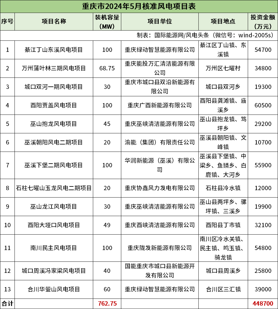 重庆核准13个风电项目,总规模762.75MW,总投资448700万元,均为陆上风电项目。