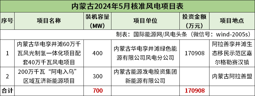 内蒙古核准2个风电项目,总规模700MW,总投资170908万元,均为陆上风电项目。
