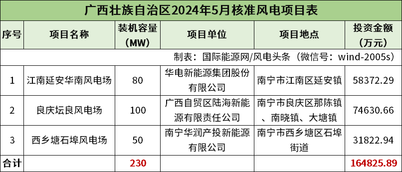 广西核准3个风电项目,总规模230MW,总投资164825.89万元,均为陆上风电项目。
