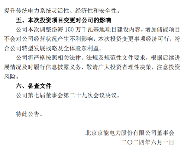 据悉,6月1日,北京京能电力股份有限公司(简称:京能电力)发布《关于调整乌兰察布市岱海150万千瓦风电绿电进京基地项目建设内容的公告》。