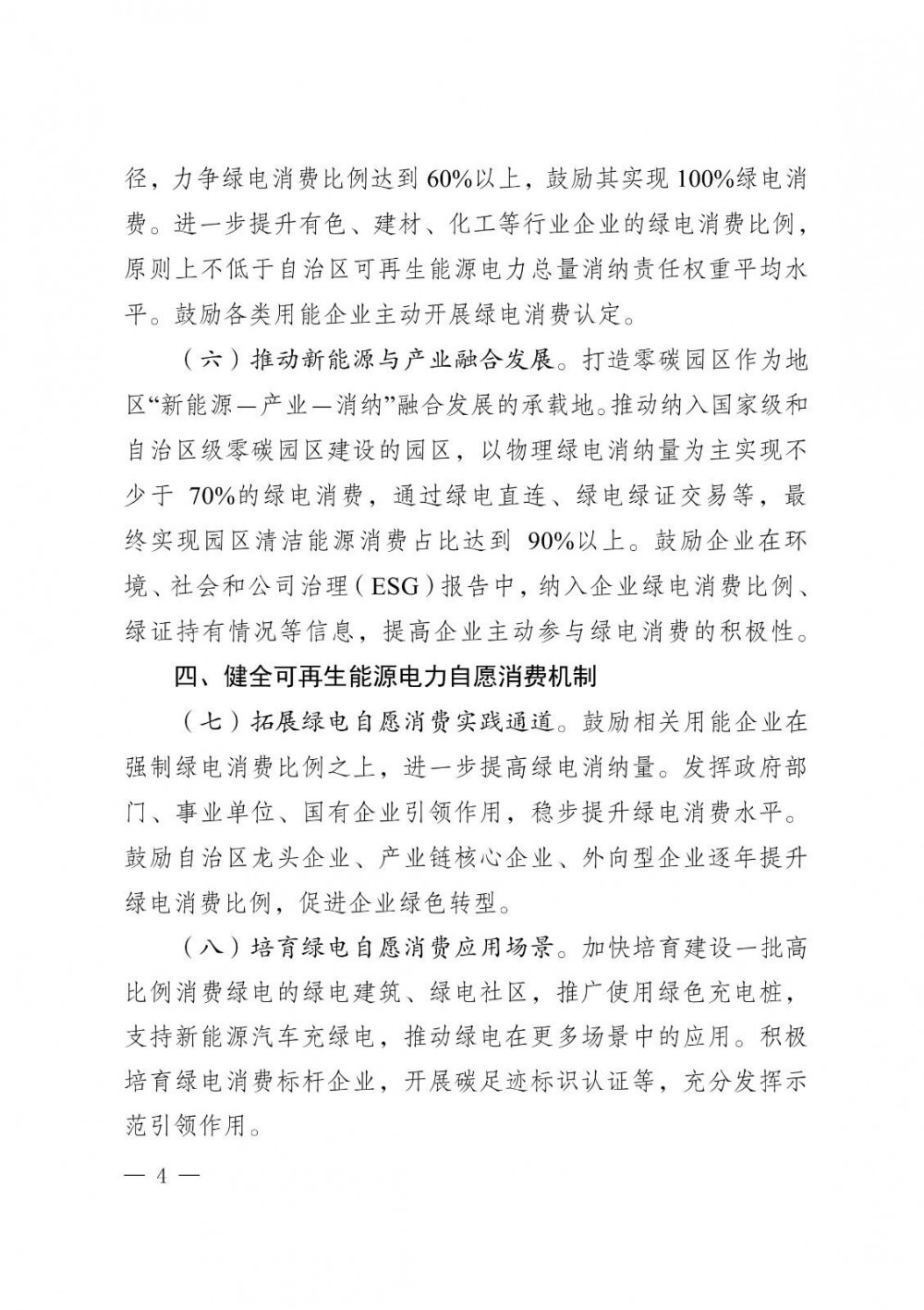 推动新能源与产业融合发展。打造零碳园区作为地区“新能源-产业-消纳”融合发展的承载地。推动纳入国家级和自治区级零碳园区建设的园区,以物理绿电消纳量为主实现不少于70%的绿电消费,通过绿电直连、绿电绿证交易等,最终实现园区清洁能源消费占比达到90%以上。鼓励企业在环境、社会和公司治理(ESG)报告中,纳入企业绿电消费比例、绿证持有情况等信息,提高企业主动参与绿电消费的积极性。