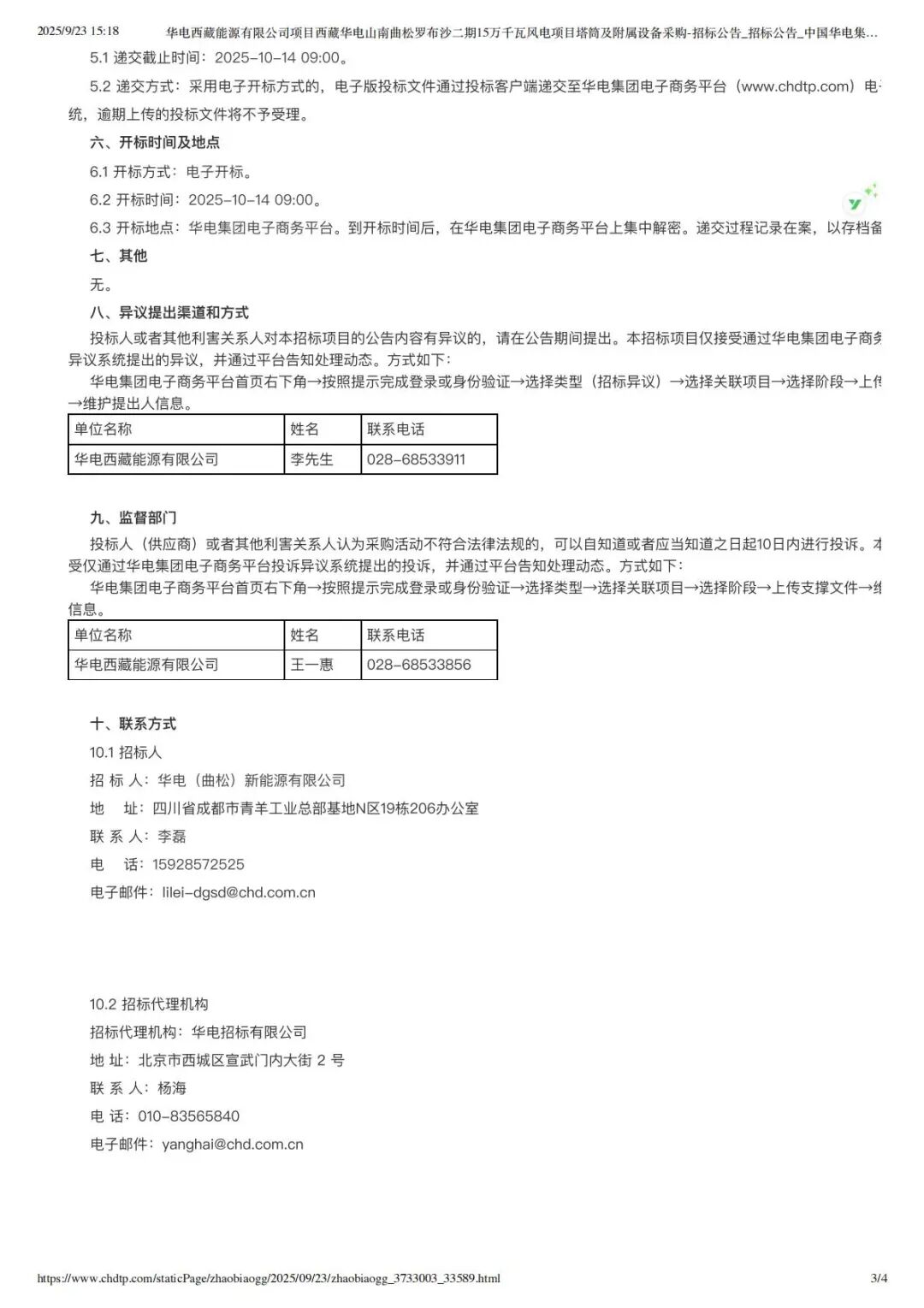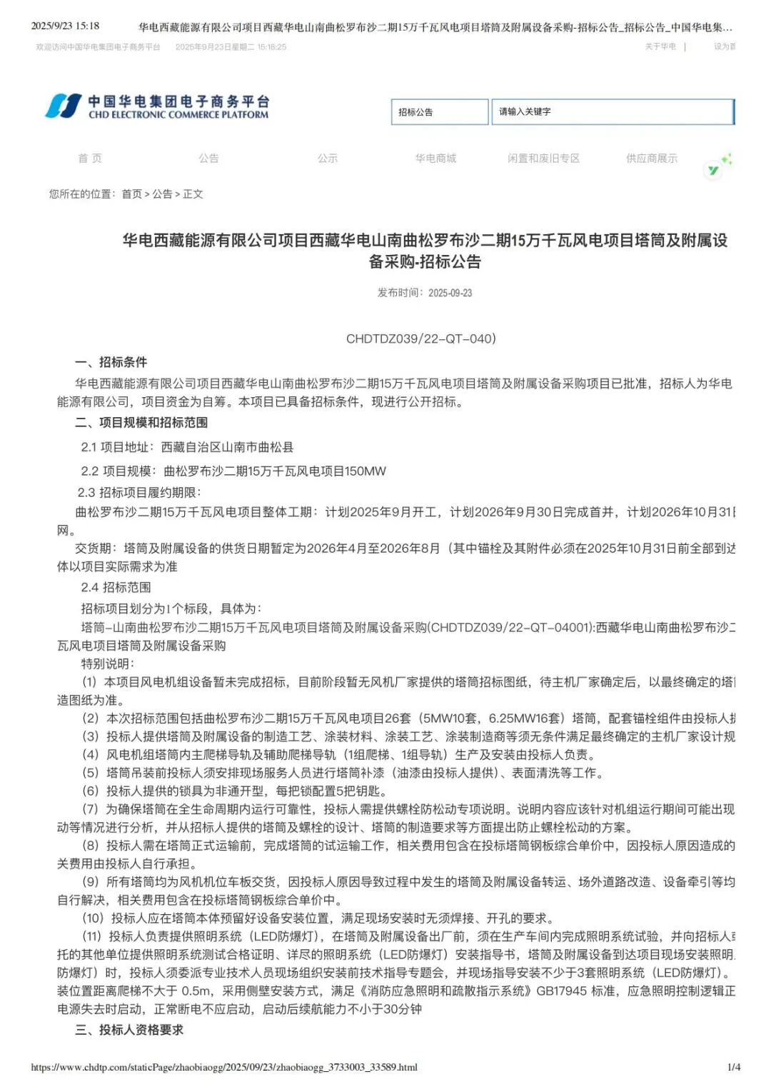 2024-04-30 9月23日新能源圈获悉,华电集团电子商务平台发布西藏华电山南曲松罗布沙二期15万千瓦风电项目塔筒及附属设备采购-招标公告。