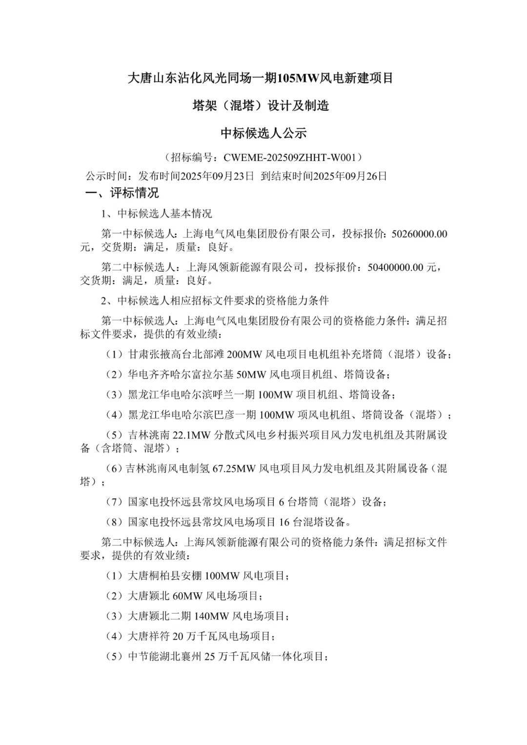 新能源圈获悉,9月23日,大唐山东沾化风光同场一期105MW风电新建项目、大唐黑龙江五大连池200MW风电项目、大唐吉林长春二热退城进郊配套100万千瓦扶余风电项目塔架(混塔)设计及制造中标候选人公示,规模合计1305MW。