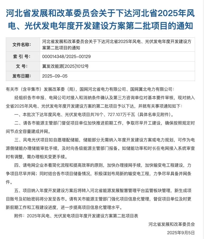 新能源圈获悉,9月24日,河北省发改委发布《河北省2025年风电、光伏发电年度开发建设方案第二批项目的通知》。