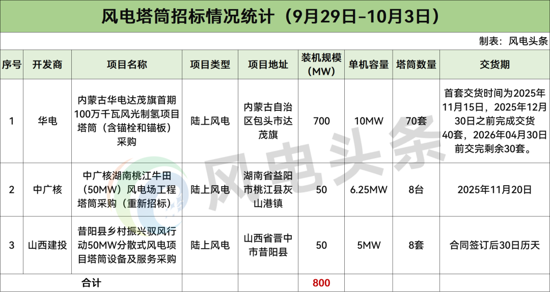 据新能源圈统计,9月29日-10月3日风电整机采购开标总计630MW,风电机组招标总计1128MW;风电塔筒招标总计800MW。
