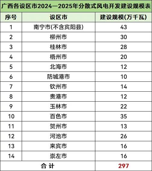 内容指出,根据广西电网开展的全区负荷预测结果和各类电源建设情况,力争到 2025 年全区实施建设分散式风电项目约 300 万千瓦。