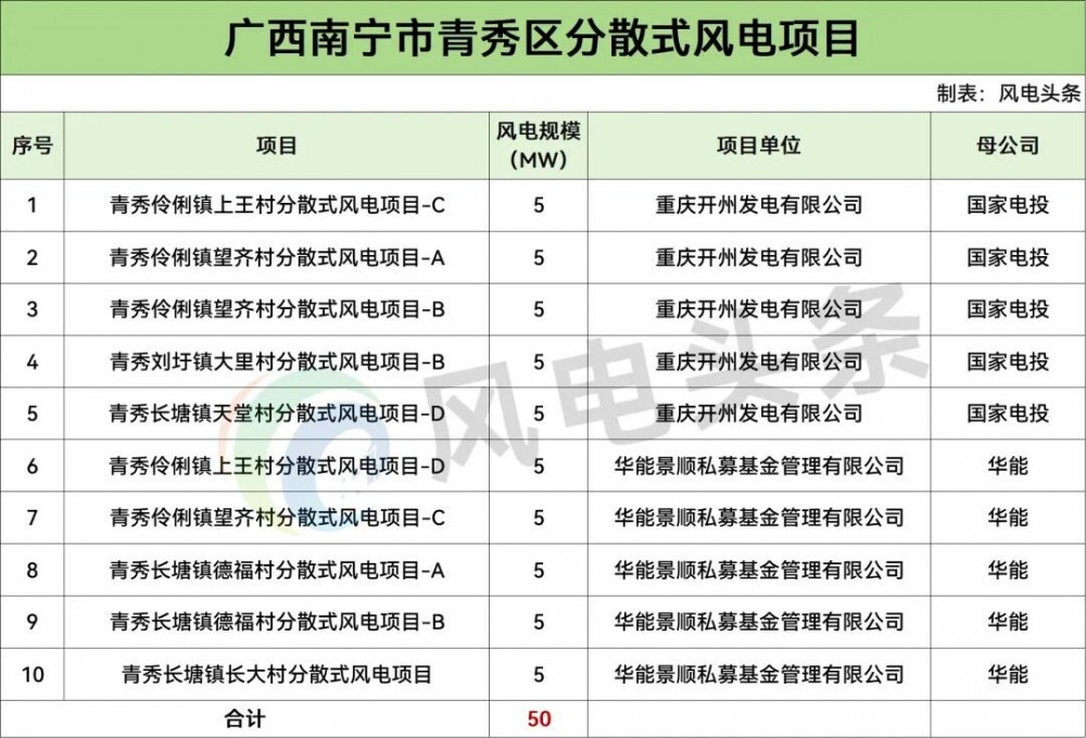 9 月 2 日,广西南宁市青秀区公示 2025 年分散式风电建设项目,拟建设青秀伶俐镇上王村分散式风电项目 - C、青秀伶俐镇望齐村分散式风电项目 - A 等 10 个项目,总容量 50MW。