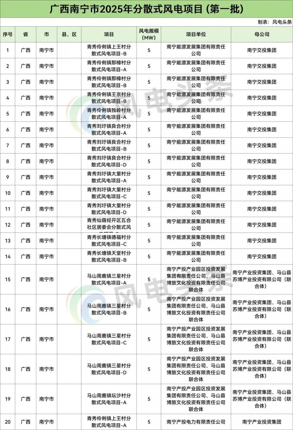 9 月 24 日,南宁市发展和改革委员会、南宁市农业农村局发布《关于印发南宁市 2025 年分散式风电项目建设方案 (第一批) 的通知》。文件指出,列入南宁市 2025 年分散式风电建设方案 (第一批) 的项目共 65 个,装机容量 325MW,均为第二类分散式风电项目,即南宁市 “千乡万村驭风行动” 试点项目。(详情查看:325MW!65 个项目!广西南宁 2025 年首批分散式风电项目建设方案出炉!)