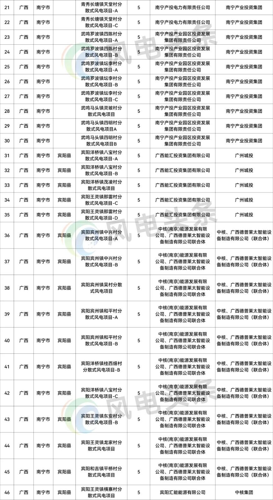 从业主方面来看,南宁交投集团、广州城投、南宁产业投资集团、滨海建投、广东能源集团、中广核、华能、京能集团、中国能建、中核等企业或联合体获得风电指标。