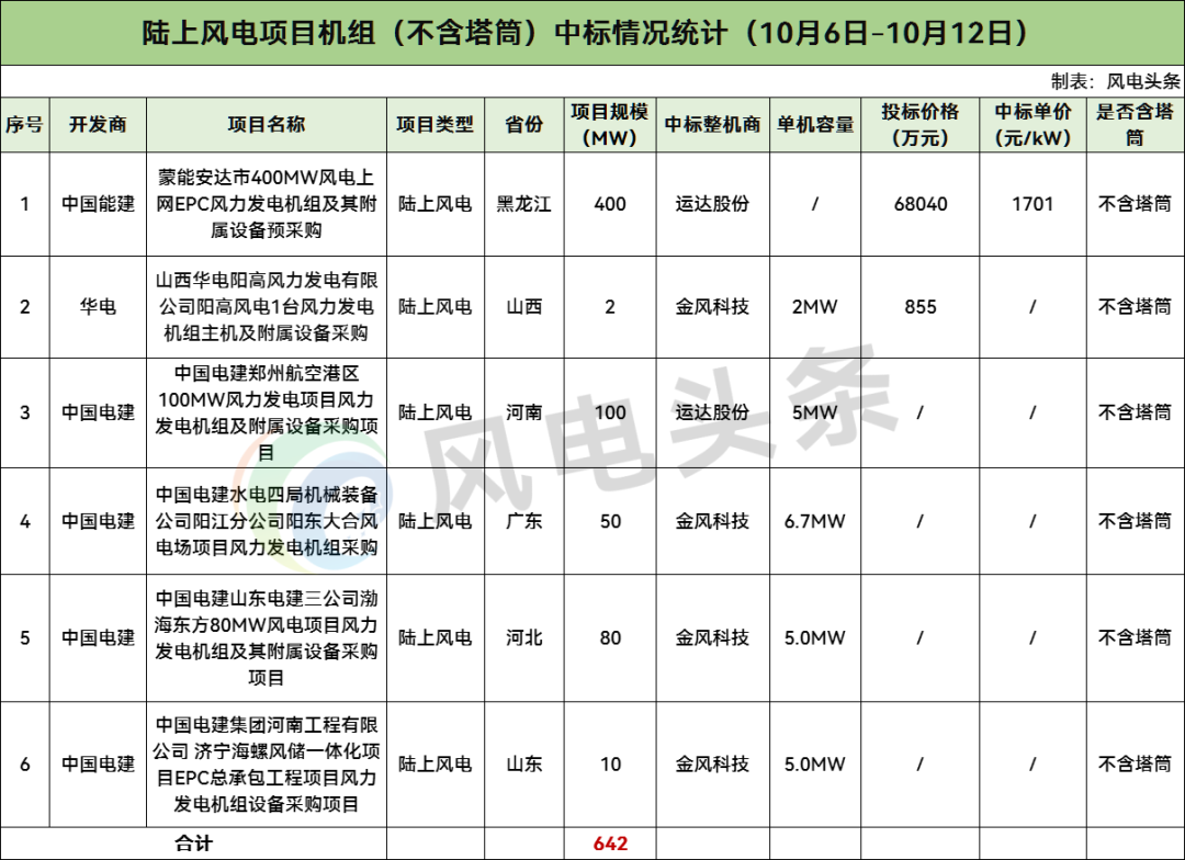 据新能源圈统计,本周不含塔筒陆上风电项目共计6个,规模总计642MW。