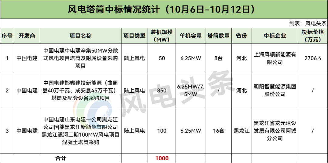 据新能源圈统计,本周有3个陆上风电项目塔筒采购开标,规模为1000MW,开发商为中国电建。