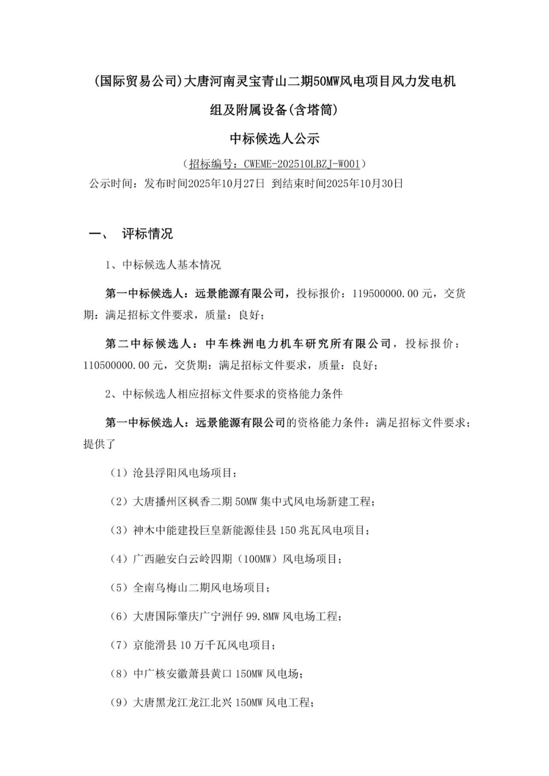 新能源圈获悉,10月27日,大唐河南灵宝青山二期50MW风电项目、大唐桂冠山东莱州67MW风电增容改造项目等4个风电项目风力发电机组及附属设备采购中标候选人公示,项目规模合计279.5MW。