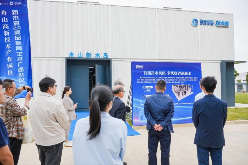 通水仪式结束后,与会人员共同实地考察了新水岛 2.0 水厂。该项目占地面积仅 300 平方米,采用金科环境自主研发的 新水岛 2.0 工程模块化产品与 水萝卜 AI 智能体 运营管理平台,以污水处理厂出水为水源,通过 超滤 + 反渗透 先进处理工艺,使供水水质远超《城市污水再生利用 工业用水水质》标准,完全满足国内外光伏企业高标准生产用水需求。项目总设计产水规模达 2 万吨 / 天,其中一期产水规模 5000 吨 / 天,服务范围覆盖舟山高新区内新能源、化工等重点工业企业,目前一期产出的再生水已主要供应园区内光伏企业,为当地新能源产业发展注入了绿色动力。