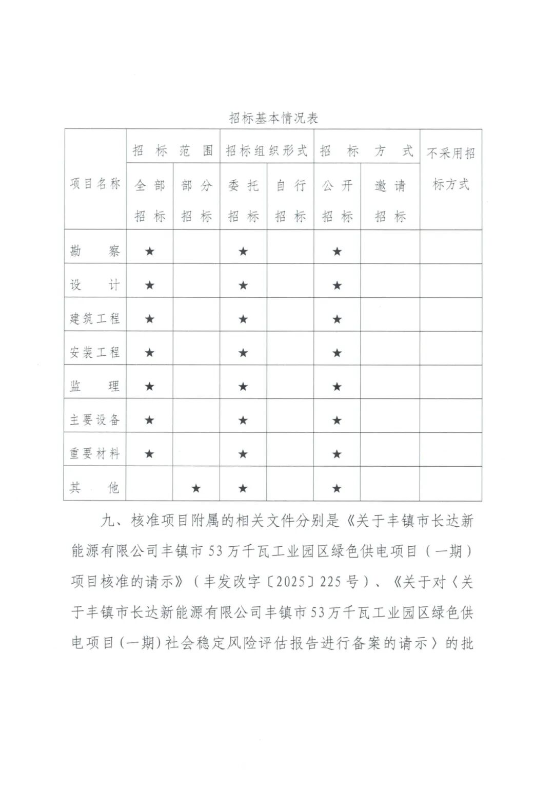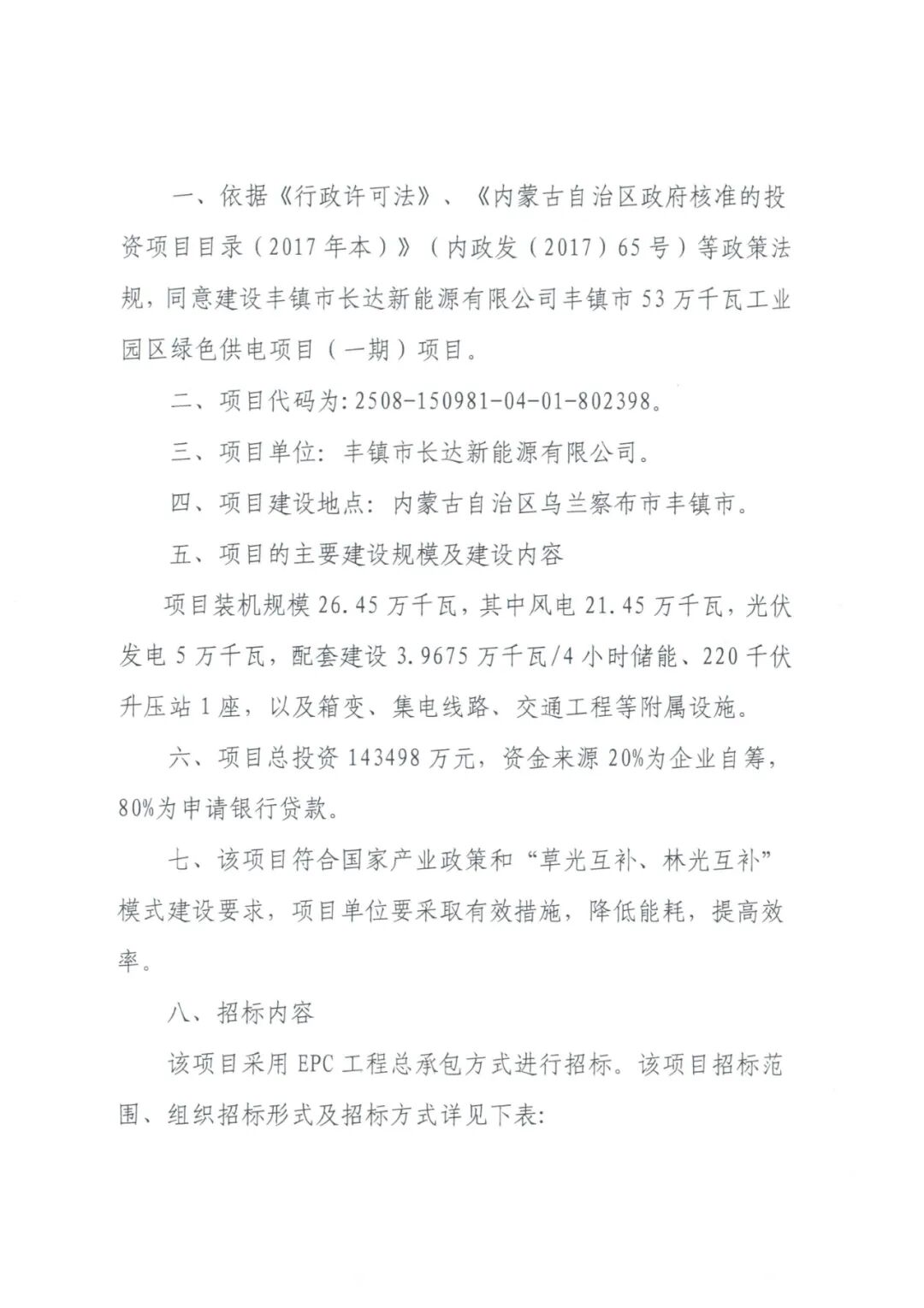 丰镇市长达新能源有限公司丰镇市53万千瓦工业园区绿色供电项目(一期)位于内蒙古自治区乌兰察布市丰镇市,项目单位为丰镇市长达新能源有限公司,项目装机规模26.45万千瓦,其中风电21.45万千瓦,光伏发电5万千瓦,配套建设3.9675万千瓦/4小时储能。项目总投资143498万元。