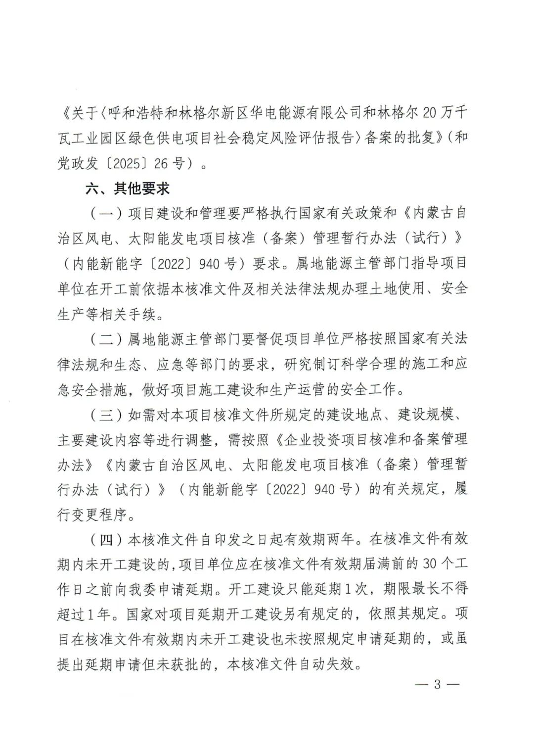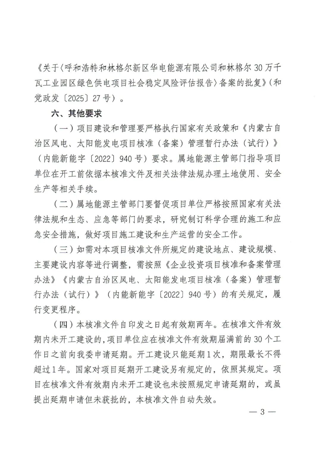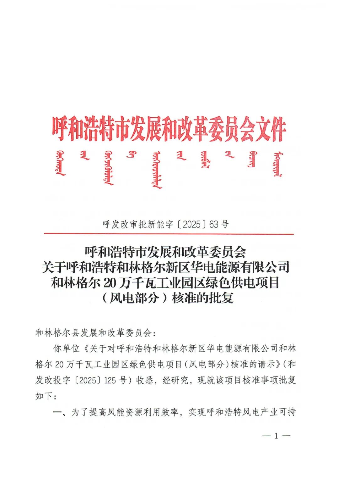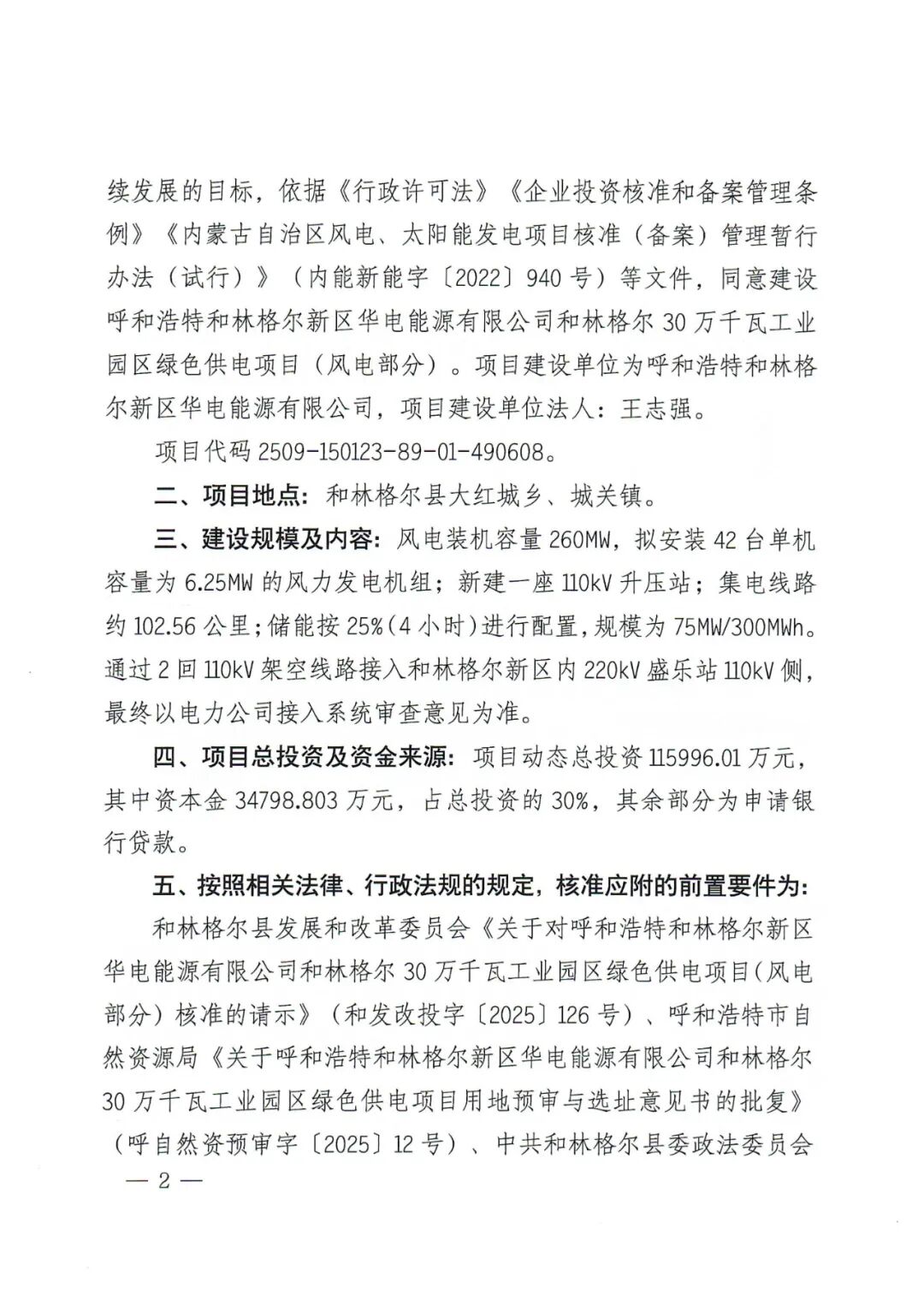 呼和浩特和林格尔新区华电能源有限公司和林格尔30万千瓦工业园区绿色供电项目(风电部分)位于和林格尔县大红城乡、城关镇,项目建设单位为呼和浩特和林格尔新区华电能源有限公司,风电装机容量260MW,拟安装42台单机容量为6.25MW的风力发电机组,储能按25%(4小时)进行配置,规模为75MW/300MWh。项目动态总投资115996.01万元。