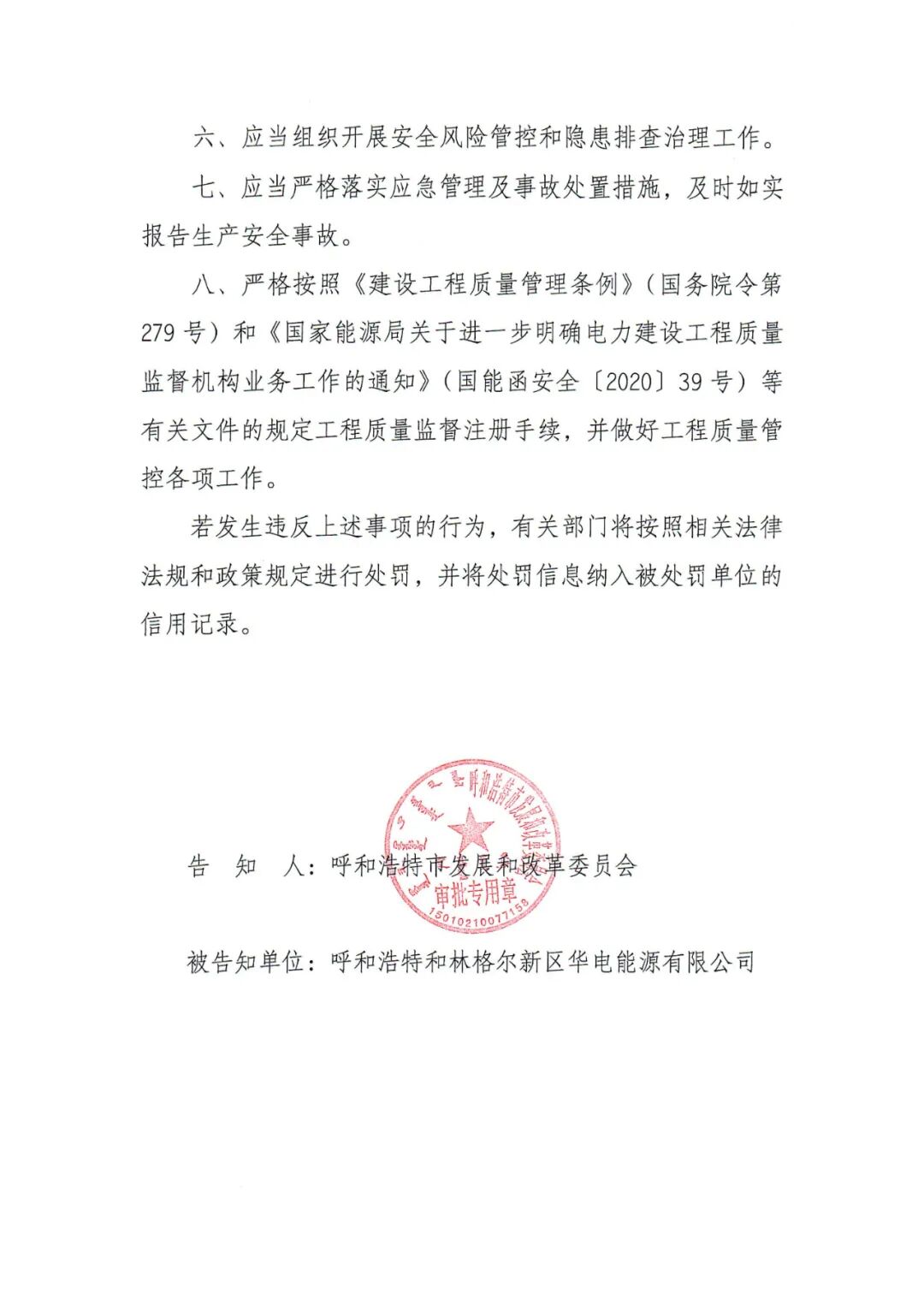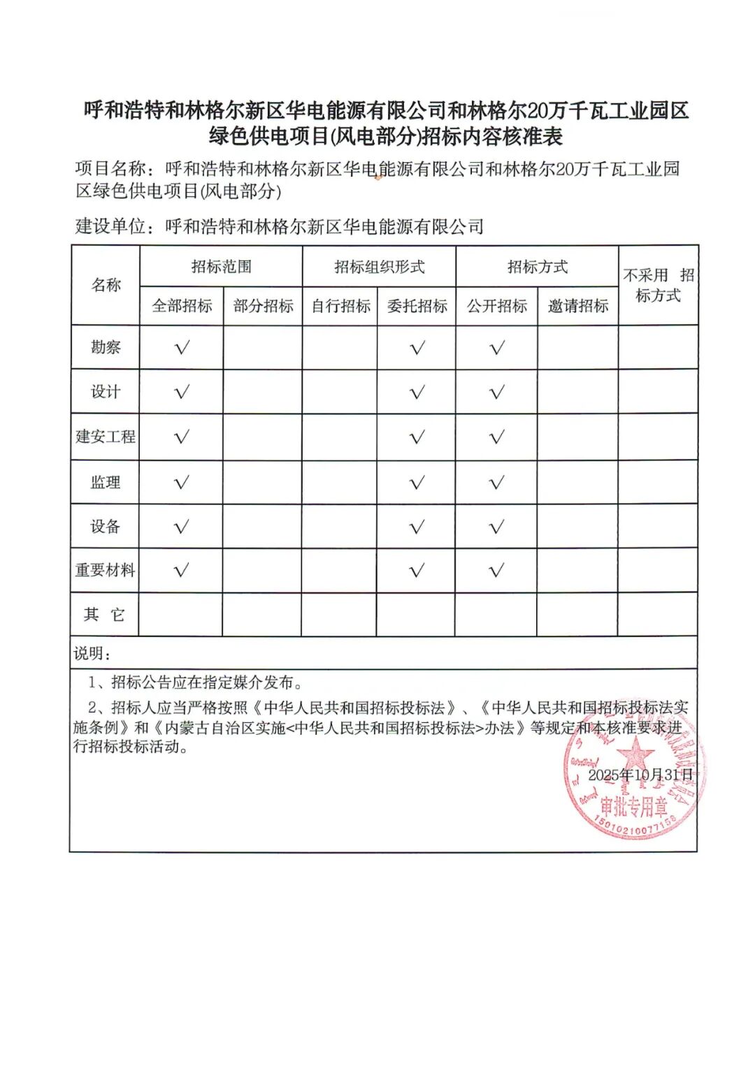 其中,呼和浩特和林格尔新区华电能源有限公司和林格尔20万千瓦工业园区绿色供电项目(风电部分)位于和林格尔县大红城乡、羊群沟乡、新店子镇,项目建设单位为呼和浩特和林格尔新区华电能源有限公司,风电装机容量150MW,拟安装24台单机容量为6.25MW的风力发电机组,储能按25%(4小时)进行配置,规模为50MW/200MWh。项目动态总投资66413.8万元。